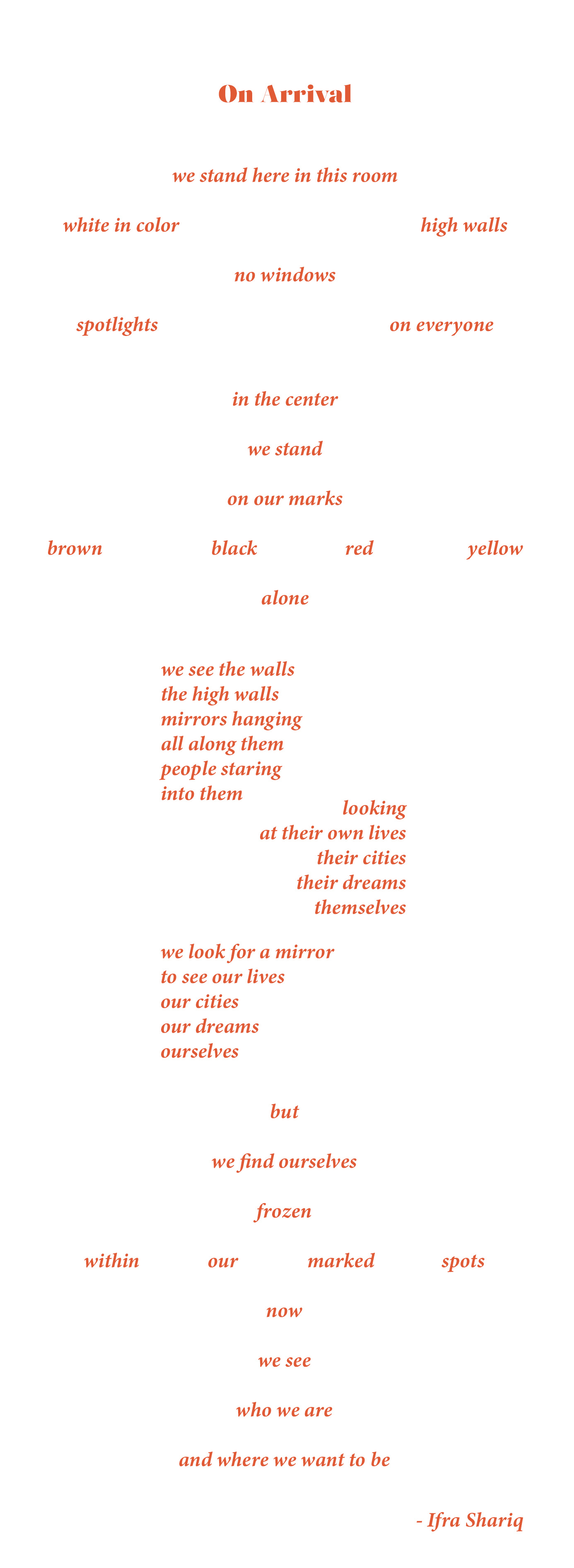Ifra Shariq has composed a reflective poem titled On Arrival, in which she shares her experience of navigating the art world. The poem expresses her emotions upon entering these unfamiliar spaces and reflects on the momentary feeling of discomfort that arises on arrival. It draws inspiration from Sara Ahmed’s article “A Phenomenology of Whiteness,” which delves into the idea that the presence of non-white bodies can induce disorientation and challenge the established order.